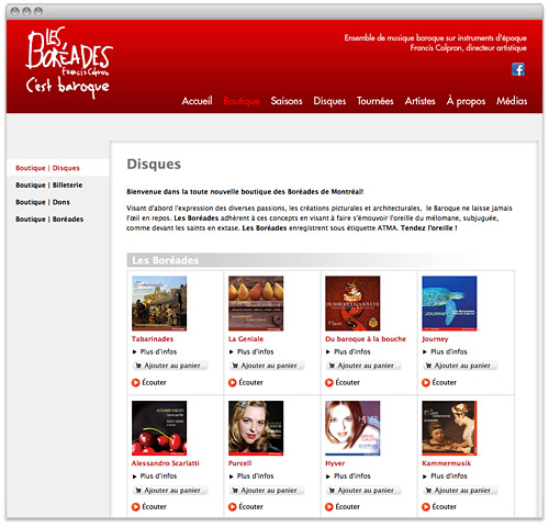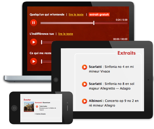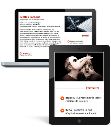 La clientèle fréquentant les sites traitant de musique est variée. Le profil des usagers est très diversifié. Le défi de GPS est de savoir adapter sa technologie. Nous voulons que tous les visiteurs puissent apprécier le contenu du site du client. Nous nous assurons qu'ils puissent le voir et surtout, l'entendre et ce, peu importe la plate-forme utilisée. Le sur mesure y trouve alors toute sa signification. De la même façon, l'environnement visuel a été pensé avec les usagers, les amateurs de musique classique, en tête. Un visuel attrayant et moderne qui met les instruments anciens en valeur. Une facilité à naviguer qui ne détourne jamais l'attention de l'usager. Et un site qui fonctionne de la même façon, quelque soit la plateforme ou le navigateur. Tout ce que vous avez à faire est de presser le bouton "Play" et vous laisser conquérir.